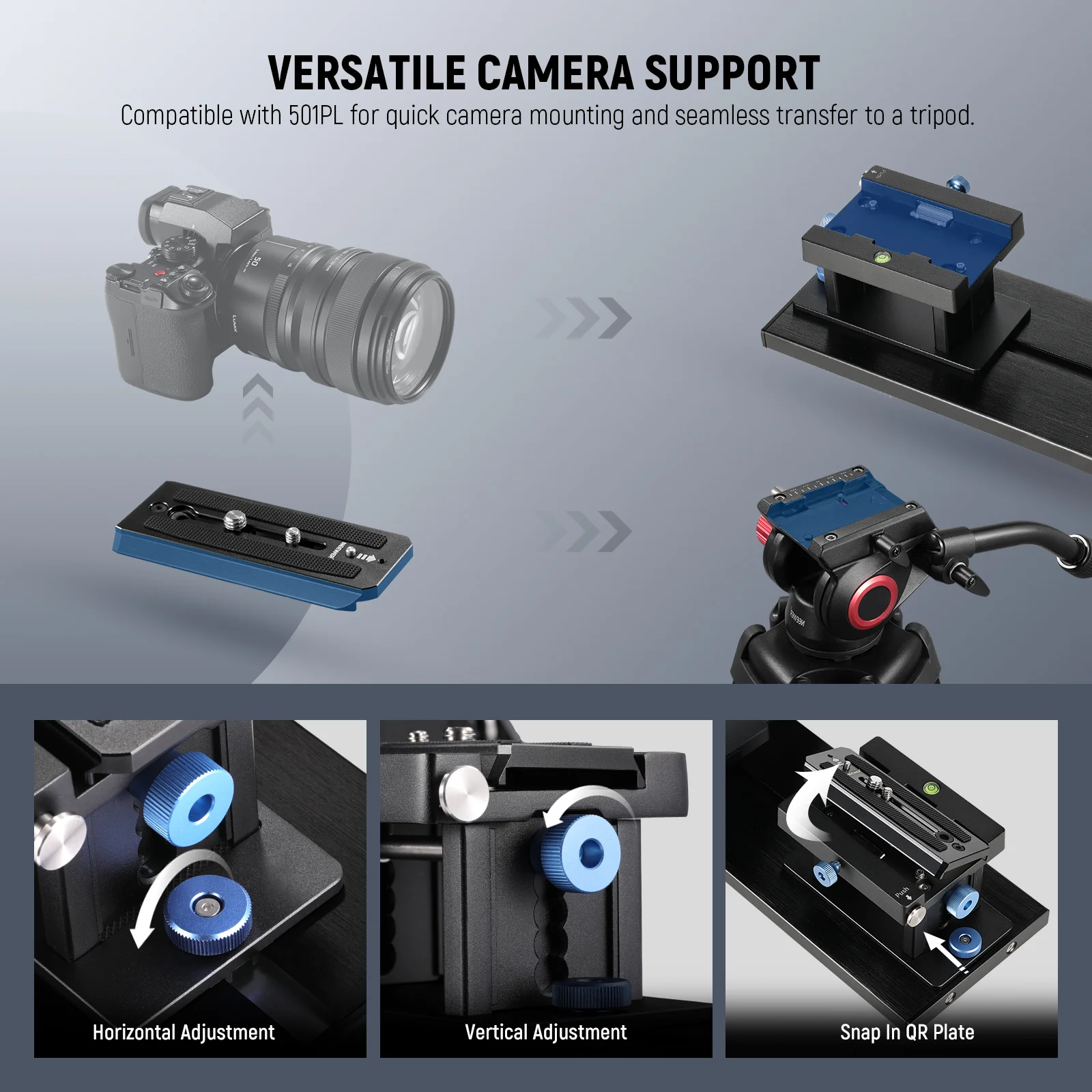 Mõõtudelt kompaktne ja vedelikuga täidetud, et tagada sujuv kadreerimine. Kaks turvalukustust ja mõõtudelt suur kiirkinnitusplaat, tagavad selle, et kaamera on turvaliselt kinnitatud. Pea sisaldab endas ka kahte vesiloodi.